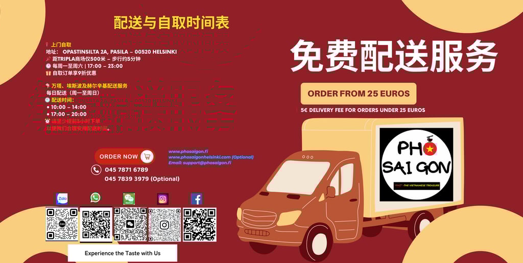 从现在起,Phở Sài Gòn 在 Uusimaa 地区提供每日配送服务,包括: